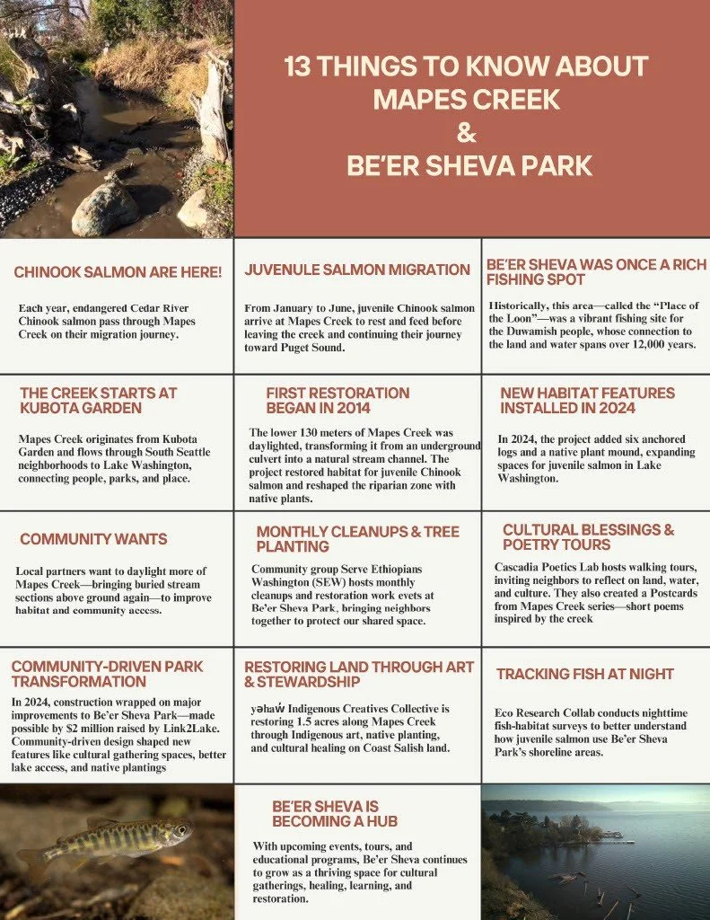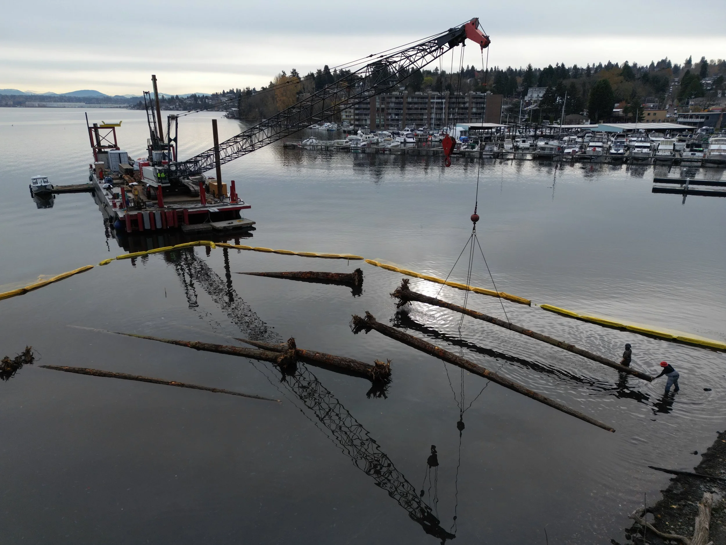 In December 2024, the second phase of Be’er Sheva improvements was completed, culminating in the restoration of aquatic habitats. This phase includes installing logs and an earth mound plant structure at the southern end of Lake Washington. It’s designed to support juvenile Chinook salmon production and emergent plant growth in this historic area.